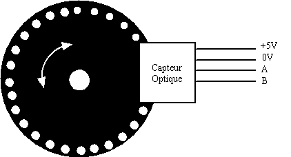 Un codeur incrémental est composé d'un disque solidaire d'un axe. Ce disque est percé d'un certain nombre de trous sur sa circonférence. Grâce à un dispositif optique, on peut savoir combien de trous ont été vus.
