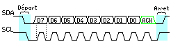 Départ : START, Arrêt : STOP Après avoir effectué un start, le maitre va transmettre des octets. Les octets sont transférés bits par bits : Le maître applique sur SDA le bit de poids fort D7.