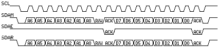 Maintenant qu'on peut envoyer un octet sur le bus, on peut voir comment en envoyer plusieurs et indiquer QUI doit les recevoir. Pour sélectionner le destinataire, on va indiquer une valeur que le destinataire connaitra : son adresse. L'adresse est formé d'un nombre entre 0 et 127 (7 bits)auqels on ajoute un bit de Read/Write qui indique si le maître va encoyer des données vers l'esclave (Write : 0), ou l'esclave envoyer des données vers le maître (Read : 1)