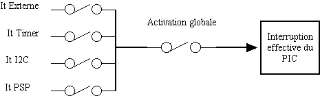 - Pour chaque interruption, il y'a un registre disant si elle est activée ou non (commandé par enable_interrupts(INT_xxx); et disable_interrupts(INT_xxx);)