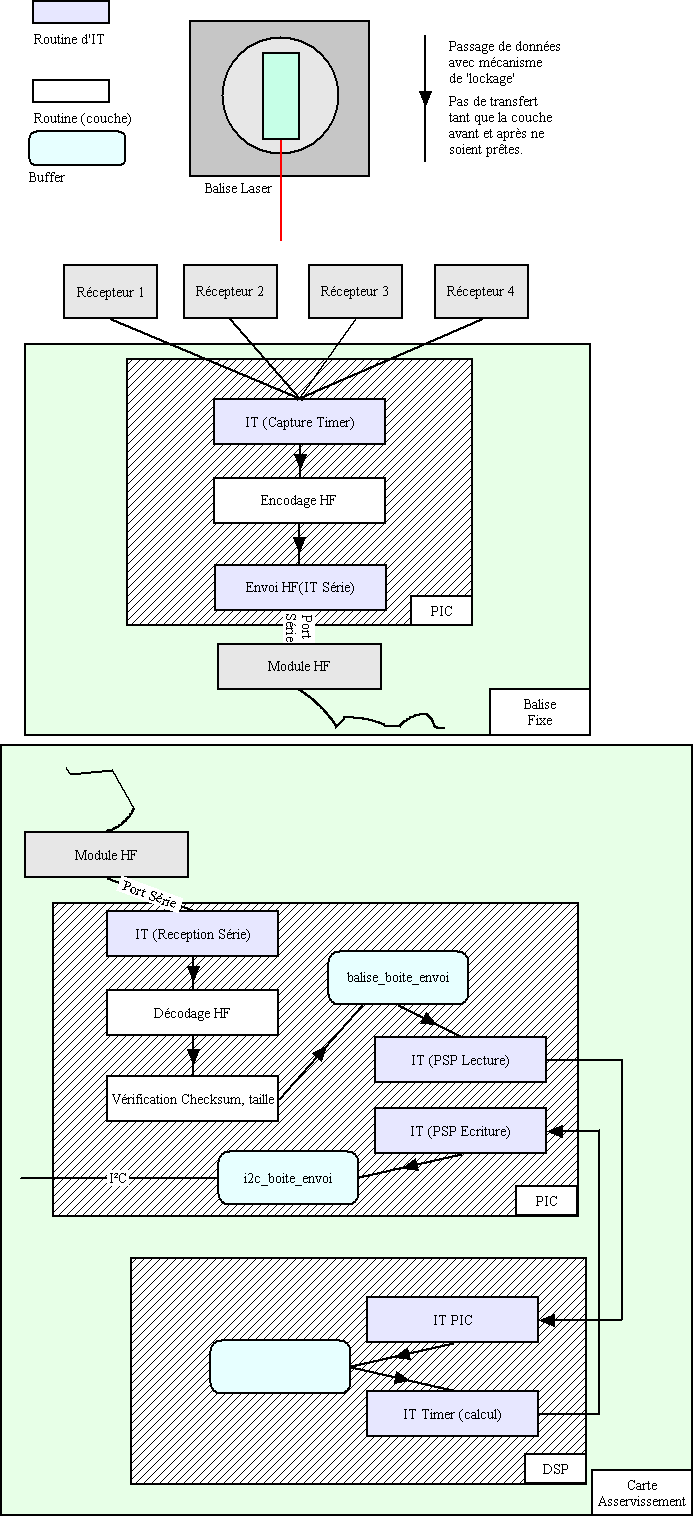 Ce système est à lui seul une TRES belle usine à gaz. Autant sur le point mécanique, matériel électronique, logiciel, etc ... c'est gros. Et les chances de succès étaient TRES minimes. Mais ça marche. Même bien, mieux qu'on aurait pu espérer. Le schéma qui suit est une reproduction d'un schéma pondu à l'époque concernant ce système de balises dans sa globalité avec les différents éléments (notamment logiciel) qu'il fait intervenir. Chaque donnée (de position de l'adversaire) passe par la bagatelle de 7 interruptions dans tout le système, celles-ci réparties sur 3 processeurs (2 PIC, 1 DSP). Les infos passent par la HF, puis 2 bus ...et un certain nombre de couches logicielles. Tout ça pour obtenir 1 seule position. Malgrés tout ça, le temps de rafraichissement est extrêmement correct. On croirait pas ... enfin bon, l'utilité du schéma était de trouver LE problème (de temps réel ...). Et il ne s'agissait pas d'un problème de temps réel, ce coup ci -- bien qu'il en reste un certain nombre dans le système -- mais un problème d'initialisation. Dans les 7 interruptions (et la petite dizaine de buffers protégés), on ne compte pas l'interrogation de la carte asservissement par la carte principale qui fait intervenir une 8ème IT (toujours sur le pov' PIC de la carte d'asservissement).