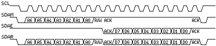 L'ACK se fait dans le cas d'une lecture, par le maître (c'est à dire que le maîtrel passe SDA à 0 et SCL à 0) pour le bit d'ACK. En fonction des systèmes, les ACK peuvent avoir des significations particulières. Il peut y avoir aussi des NACK (Not ACK), c'est à dire que par exemple, le slave ne va pas générer d'ACK, volontairement pour indiquer de terminer le transfert par exemple.