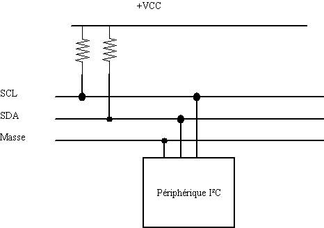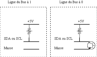 Il s'agit de sorties 'collecteur ouvert' Il y a 2 pull-up, permettant, lorsqu'aucun périphérique n'impose quelquechose sur le bus, que le bus soit à 1 (5V). Il n'est donc pas possible d'endommager le bus même en ayant des emetteur/recepteur faisant n'importe quoi (tant qu'aucun d'entre eux n'impose 5V directement). La valeur des pull-up est un débat à lui tout seul. Plus le pull-up est élevé et moins la ligne est 'fortement' ramenée au +5V. Les périphériques, pour imposer 0V auront besoin d'écouler moins de courant. Par contre le bus sera beaucoup plus sensible aux parasites. Plus le pull-up est faible, et plus la ligne est 'fortrment' ramenée au +5V. Les périphériques doivent écouler plus de courant pour imposer 0V (dans l'hypothèse ou ça ne dépasse pas leur limite max de courant qu'une E/S peut écouler). Par contre le bus est moins sensible aux parasites. Plus une E/S doit écouler de courant et plus son temps de commutation (entre 0 et 5V) sera long. On peut aussi voir ça comme ceci :